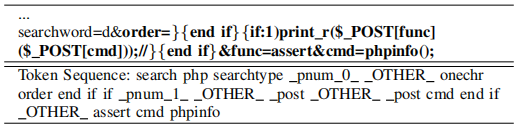2)令牌序列:建立词汇表后,可以将请求转换为令牌序列。此步骤由令牌解析器完成。简单地说,它仅保留词汇表中的单词并过滤其他单词。前表可以看到一些变量被占位符代替。