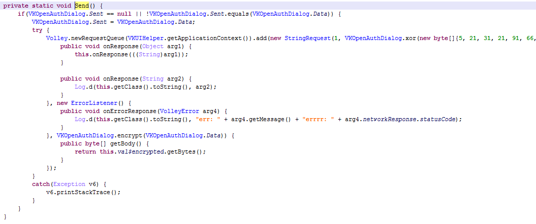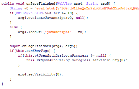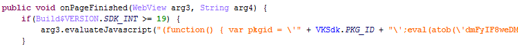 犯罪分子通过Google Play来传播恶意软件已超过两年多时间,因此他们必须修改应用代码以绕过官方检测机制。在这些应用中,犯罪分子使用了修改版的VK SDK以及一些“巧妙”的代码来完成这一任务:用户登录的的确是正常页面,但犯罪分子使用了恶意的JS代码从登录页面中窃取凭据信息,并将这些信息传递回应用程序。
