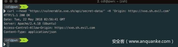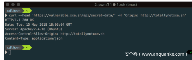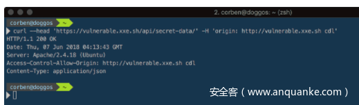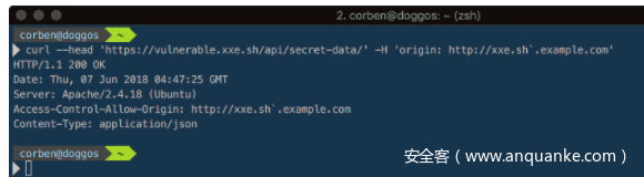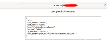 和之前描述的一样,由于正则匹配的是ascii和. –,在xxe.sh后的特殊字符是被信任的。如果我们打开safari,访问http://x.xxe.sh{.<your-domain>/cors-poc,我们可以看到成功的获取到了数据: