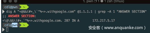 例如:dig A “<@$&(#+_`^%~>.withgoogle.com” @1.1.1.1 | grep -A 1 “ANSWER SECTION”