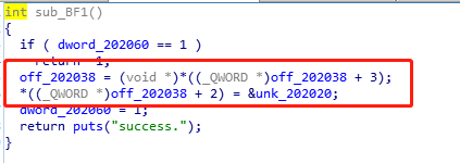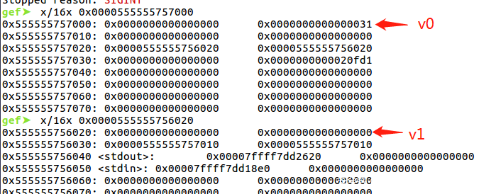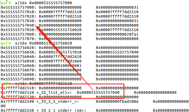 第二个函数和第三个函数只能执行一次,有个任意地址写漏洞,这时我们可以利用第二个函数改写off_202038+3d为_IO_list_all-0x10,然后分别执行第三和第一个函数,最后_IO_list_all就会指向0x555555757040的位置