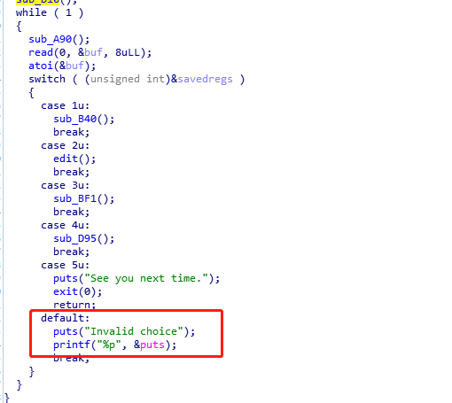 这里当输入一个不合法的选项时,就会输出puts的地址,用于泄露libc的基地址。