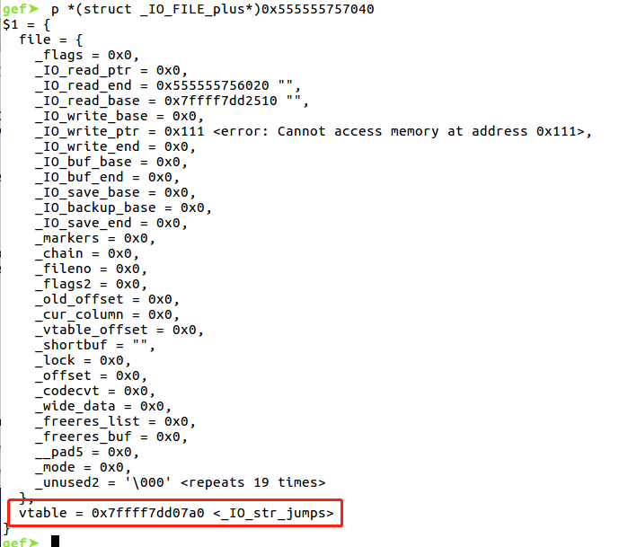 其中包含了一个重要的虚表*vtable,它是IO_jump_t 类型的指针,偏移是0xd8,保存了一些重要的函数指针,我们一般就是改这里的指针来控制程序执行流。其定义如下