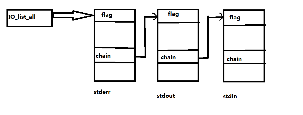 FILE结构体会通过struct _IO_FILE *_chain链接成一个链表,64位程序下其偏移为0x60,链表头部用_IO_list_all指针表示。如下图所示