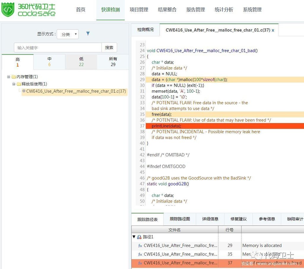使用360代码卫士对上述示例代码进行检测,可以检出“释放后使用”缺陷,显示等级为高。如图1所示:
