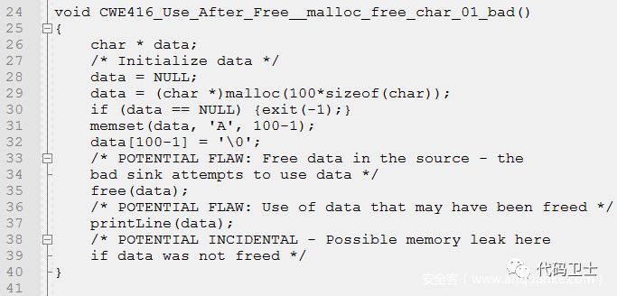 在上述修复代码中,Samate 给出的修复方式为:在第30行使用 malloc()进行内存分配,并在第36行处使用 free() 进行释放,释放后不在对该内存进行其他操作。