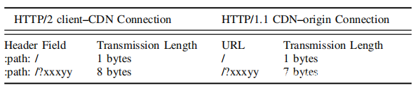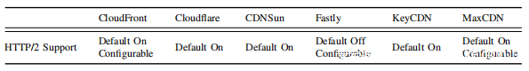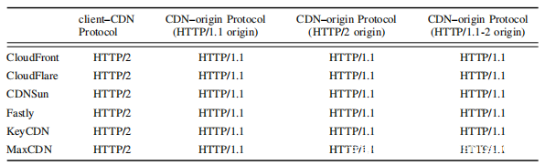 Half-Done HTTP/2 Support:几乎所有CDN供应商都声称他们当前支持HTTP/2 。但是,由于CDN必须同时维护客户端CDN连接和CDN源连接,因此尚未对HTTP/2转发行为进行详细研究。在这里,首先通过将网站的源设置为仅HTTP/1.1服务器,仅HTTP/2服务器以及HTTP/1.1&HTTP/2服务器,来探索CDN的HTTP/2支持行为。然后,使用curl工具作为客户端,以HTTP/2协议访问CDN服务。