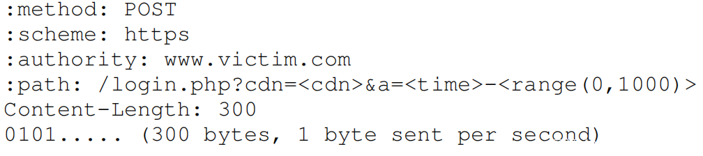 Pre-POST HTTP/2攻击:鉴于CDN在客户端与CDN的连接中支持HTTP/2,还将进一步评估针对源的慢速HTTP/2 POST攻击。为了使用HTTP/2的复用流功能,与CDN建立10个同时HTTP/2连接,并在每个HTTP/2连接中发送100个POST请求。 POST请求的设计如下: