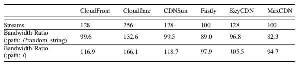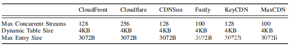 在一个HTTP/2连接中,放大率相对于并发流的数量是线性的。建立HTTP/2连接时,协商并发流的最大值。测量CDN的流限制,并将它们列出在下表中。在所有六个CDN中,允许的最大并发流都大于100(RFC中的建议值)。
