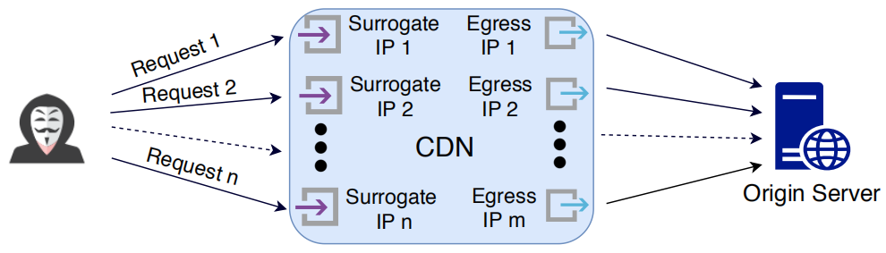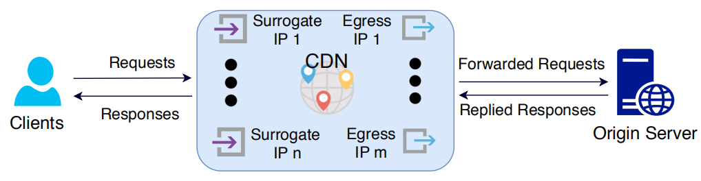 内容交付网络:CDN被广泛用于改善网站的性能和安全性。对于以CDN为动力的网站,CDN通过使用请求路由机制(例如,基于Anycast或DNS的方法)来加快连接性能,该机制将客户端的Web请求重定向到地理上分布的CDN代理(CDN入口IP )。