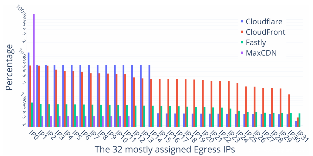 此外,在相同的24小时测量持续时间内,分析了出口IP搅动率(或发生率),它描述了CDN重复分配相同出口IP的频率。在上图(Y轴为对数比例)中,为简单起见仅绘制了前32个分配最多的出口IP 4的比率。从图中可以看到96.32%的MaxCDN请求来自一个单一的出口IP。换句话说,MaxCDN仅通过一个出口IP分配了大多数请求。另一方面,对于其他CDN,可以在图中看到它们的出口IP被更均匀或随机地分配,其中出口IP所收取的请求不超过10%。