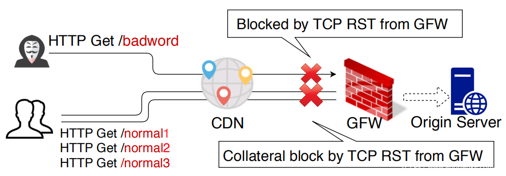 CDN仍支持CDN源连接中的纯文本HTTP协议,路径上的网络基础设施可以拦截该协议。如下图所示,当GFW已位于CDN与源之间的路径上时,攻击者可以故意发送HTTP GET请求以及GFW禁止的词,以激活GFW的连接重置机制。