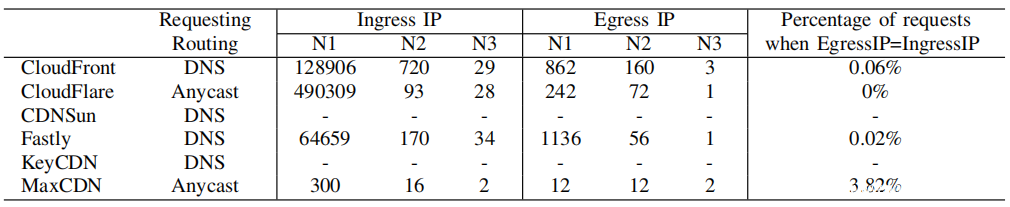为了尽可能多地收集出口IP,每隔24小时向入口IP发送一次请求,并在源处记录结果数据。上表中显示了删除重复项后的出口IP数量以及它们的BGP前缀和ASes(由Route View Project 数据确定)。从上表可以看到,即使CDN具有大量的入口IP,CDN也会对传入的请求进行分组,并分配少量的出口IP,以将请求转发到源。还发现对于每个转发的请求,请求的出口IP与入口IP不同,例如在24小时范围内,通过CloudFront发送的请求中只有0.06%具有相同的入口/出口IP,其他CDN的相应百分比为Cloudflare为0%,Fastly为0.02%和MaxCDN为3.82%。