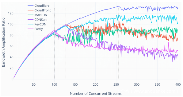 在实验中,为了探索并发流对放大率的影响,更改了一个HTTP / 2连接内的并发流数,并使用tcpdump捕获了客户端CDN连接和CDN起源连接中的流量评估放大系数。