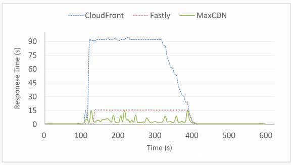 对于CloudFront和Fastly,为耗尽源1000个连接的限制,同时向CDN发送1100个慢速POST请求。在源位置连接资源已耗尽,其他请求却一直等待。因此,如下图所示,对于CloudFront,普通客户端的请求延迟上升到90 s(返回HTTP 504网关超时),对于Fastly(返回HTTP 503服务不可用)上升到15 s,这证明了DoS的成功攻击。