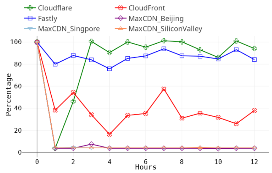 在实验中,在0小时将请求发送到给定CDN的所有入口IP,以模拟访问网站的全球客户,并获得成功请求的数量作为计算以下访问率的基础。