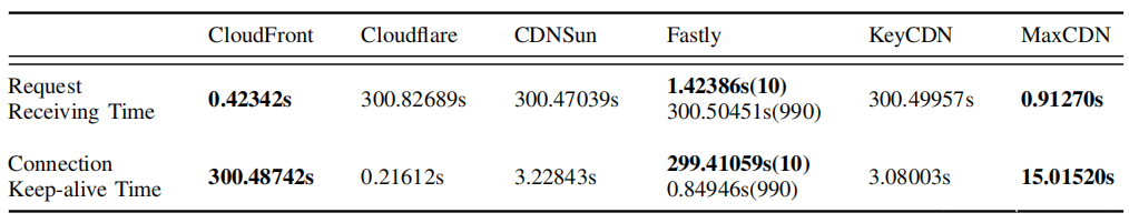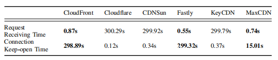 可以看到CloudFront和Fastly一旦收到转发请求标头就开始转发POST请求,而CDNSun,KeyCDN和Cloudflare仅在收到整个消息后才开始转发POST请求。 MaxCDN也将在0.74 s之后开始转发POST请求,但是当保持打开时间超过15 s时中止连接。