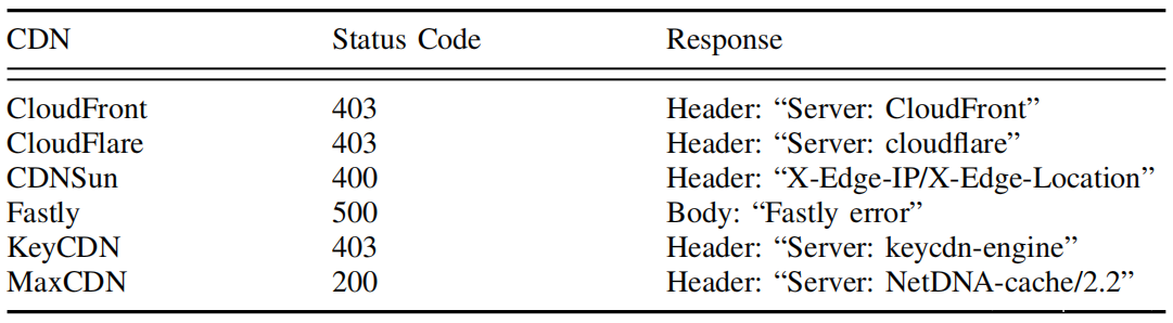 入口IP分配:通过将网站部署在CDN后面,互联网范围的HTTP扫描是一种收集入口IP的直接方法,通过它可以访问网站内容。首先使用Censys Internet HTTP扫描数据来过滤可能的入口IP。 Censys项目使用填充有扫描IP地址的Host标头扫描TCP端口80,并且CDN代理服务器在使用不正确的IP格式HTTP Host标头访问它们时,将返回独特的错误HTTP响应(标头或正文),如下表所示。