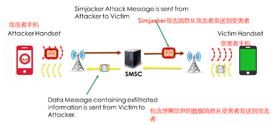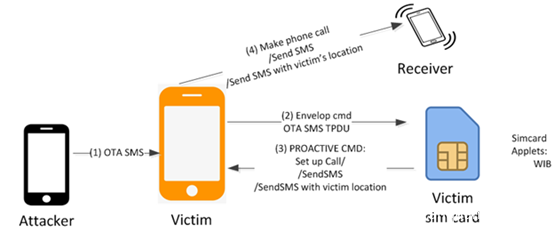 攻击场景如下所示,首先攻击者向受害人的电话号码发送了恶意的OTA SMS,也就是空中下载短信,OTA SMS中包含了WIB命令,当受害者受到信息后,其会立即使用Envelop命令(一条在手机和SIM卡之间进行通信的应用协议数据单元APDU命令)将OTA SMS的传送协议数据单元转发到受害者Sim卡中的WIB浏览器。