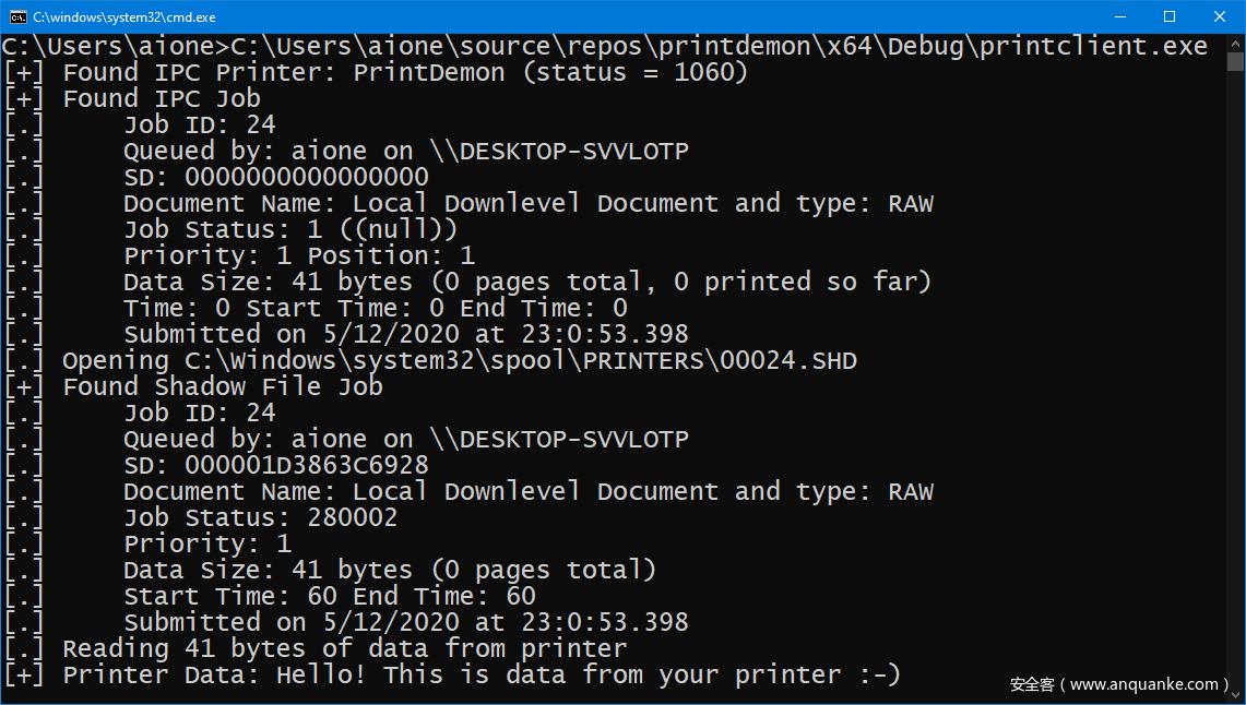 Spooler有个最有趣(也是最有用)的一个特性:可以用来作为进程间、跨用户甚至重启后(以及潜在的网络)的通信渠道。我们实际上可以将打印机看成一个安全对象(从技术角度来看,打印机作业也是安全对象,但官方并没有公开该对象),然后可以通过两种方式在其中发起读写操作: