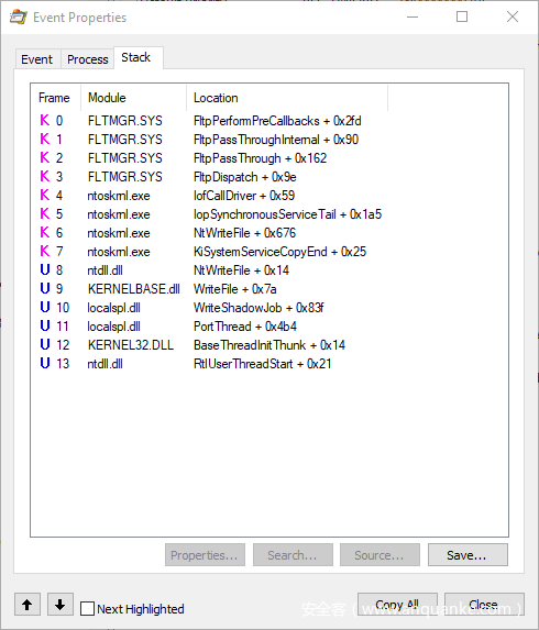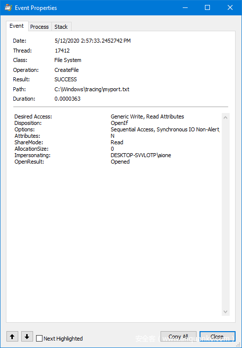 随后是创建文件操作。不幸的是,Process Monitor始终显示的是主令牌,如果我们双击该事件,可以看到该操作通过模拟(impersonation)方式来完成: