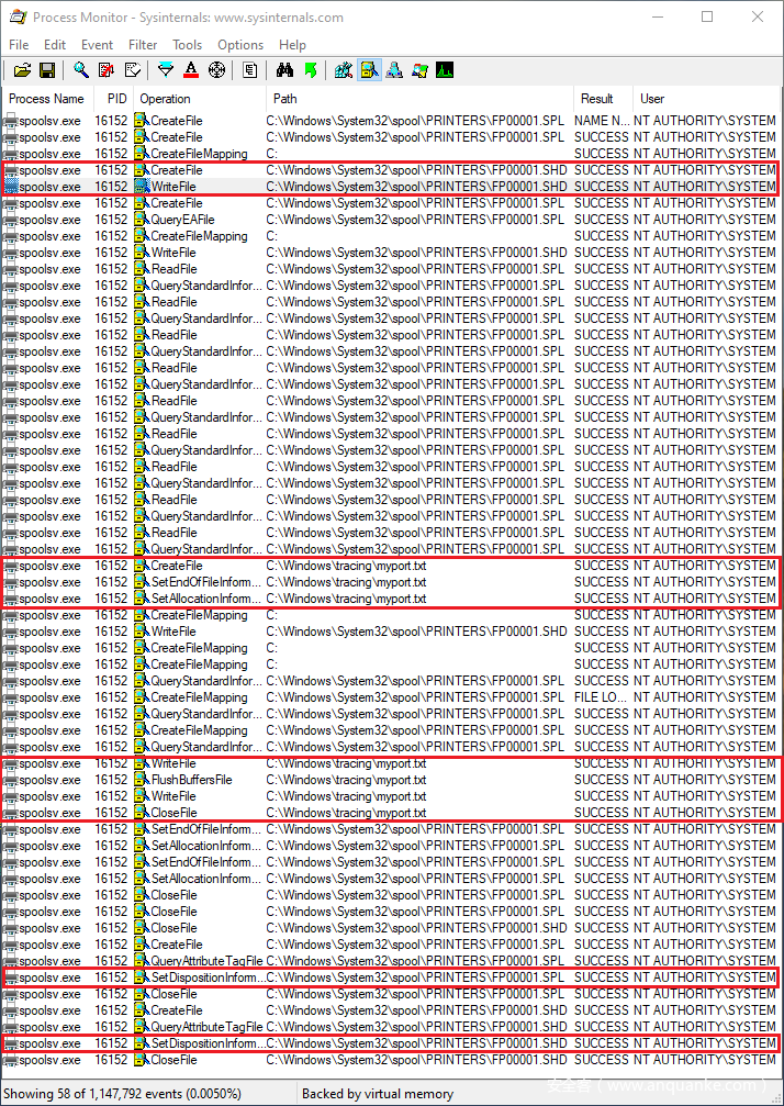 2、采用ReadPrinter和WritePrinter 时的读写操作并没有在模拟上下文中进行,这意味着这些操作看上去似乎由以SYSTEM运行的Spoolsv.exe来发起。