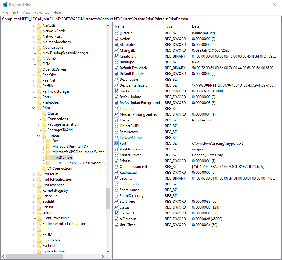 Add-Printer -Name "PrintDemon" -DriverName "Generic / Text Only" -PortName "c:\windows\tracing\myport.txt"