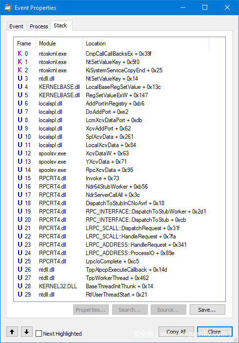 从图中可知:打印机端口实际上是注册表值,路径为HKLM\SOFTWARE\Microsoft\Windows NT\CurrentVersion\Ports。显然,只有特权用户才能写入该键值,但Spooler服务通过RPC帮我们完成该操作,调用栈如下所示: