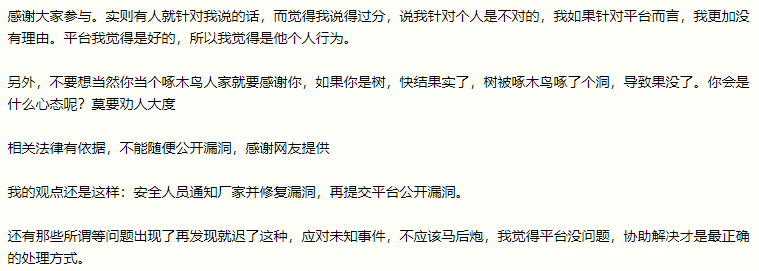 随即该网友又在下方发表了回帖,表示不是针对个人,更加不是针对平台,并发表观点:“安全人员应该通知厂家并修复漏洞 ,再提交平台公开漏洞”。