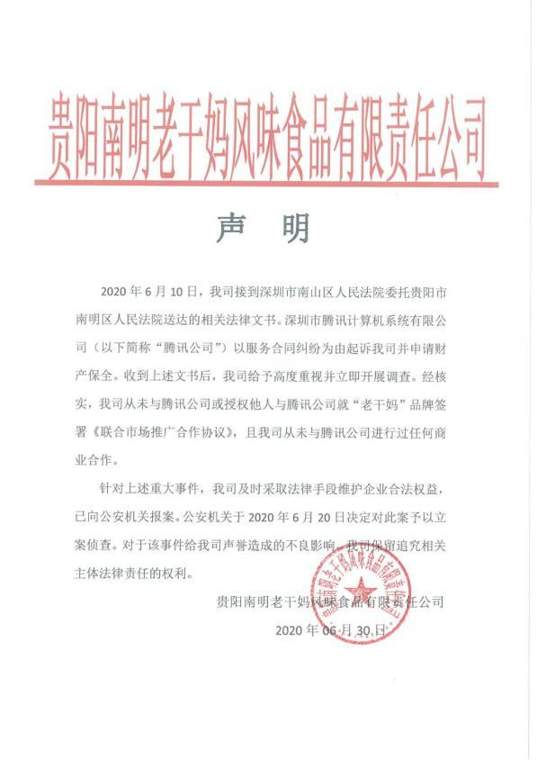 6月30日晚间,老干妈官方微信针对该事件发布声明回应了这起纠纷案,声明表示“经核实,我司从未与腾讯公司或授权他人与腾讯公司就‘老干妈’品牌签署《联合市场推广合作协议》,且我司从未与腾讯公司进行过任何商业合作。”
