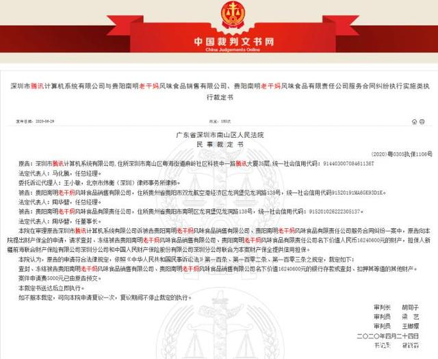 6月29日,中国裁判文书网发布了《深圳市腾讯计算机系统有限公司与贵阳南明老干妈风味食品销售有限公司、贵阳南明老干妈风味食品有限责任公司服务合同纠纷执行实施类执行裁定书》,《裁定书》显示,法院同意原告腾讯请求查封、冻结被告老干妈名下价值1624.06万元的财产。