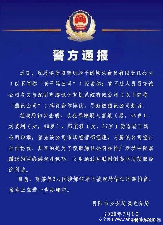 腾讯状告老干妈被骗,实则3人为游戏礼包码伪造印章