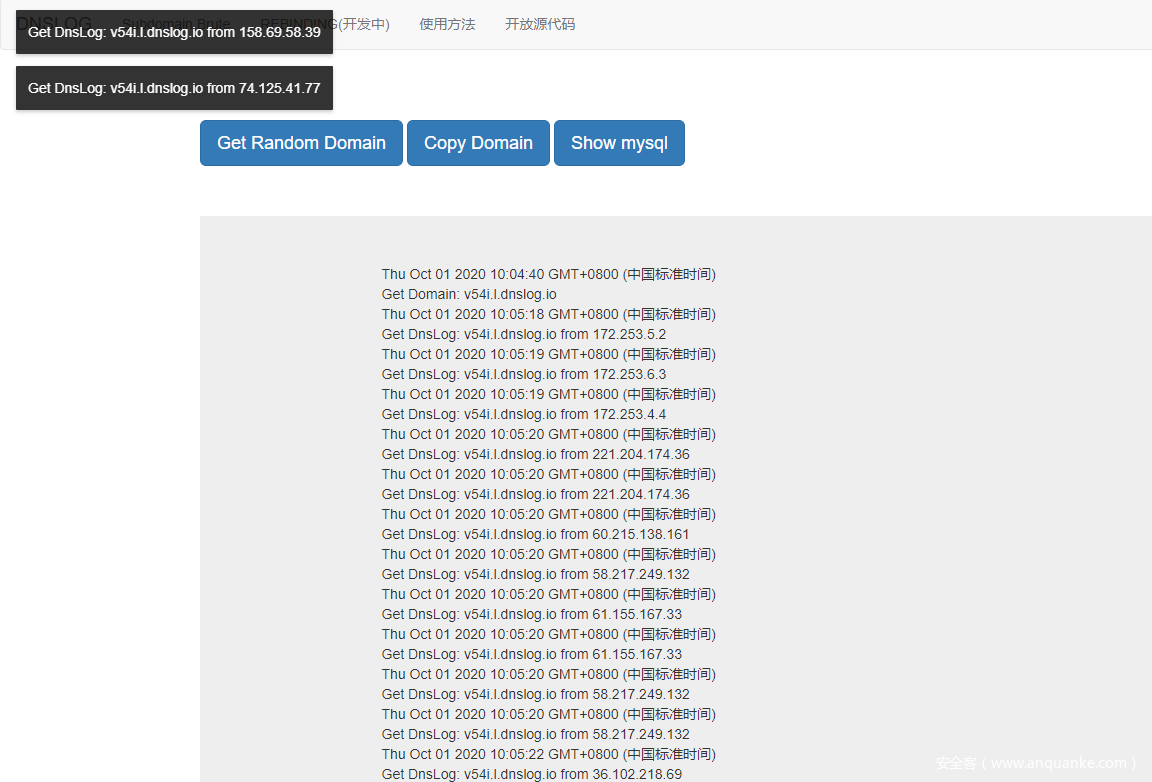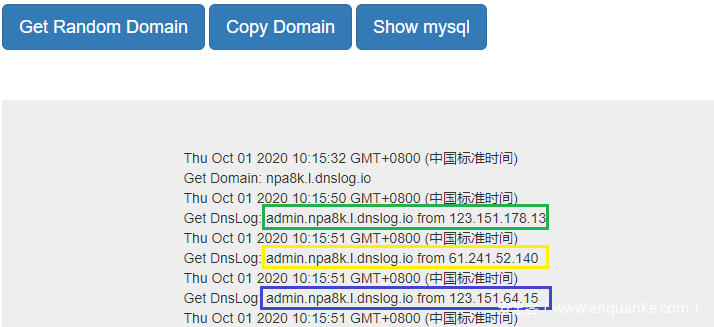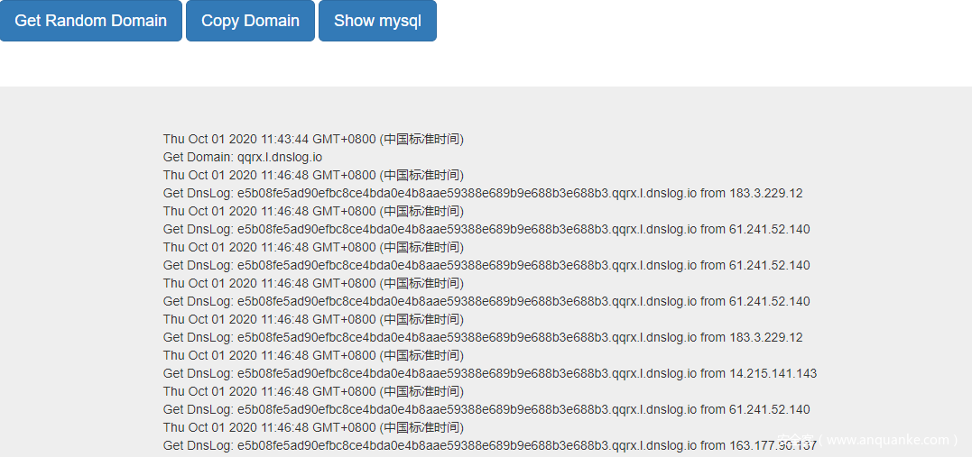 攻击者的DNSLOG平台上面,就是这个样子了,突突突的一阵狂跳,结果没一个是他想要的。