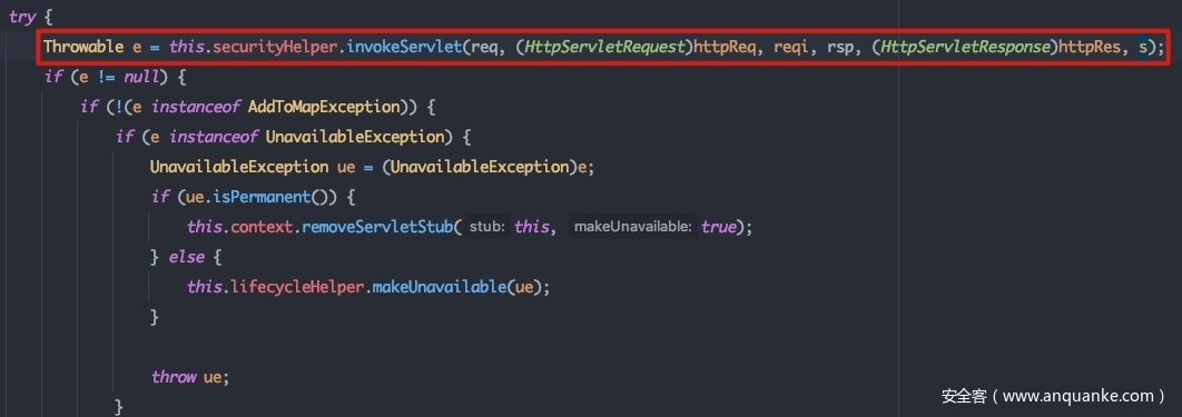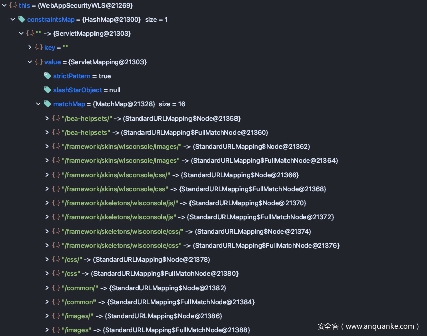 在这里我们先不向后跟进,在此处下个断点向上跟踪一下,看一下Weblogic路由映射及路由鉴权在哪里触发。调用栈如下: