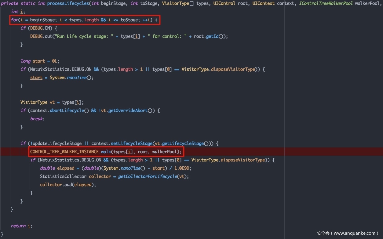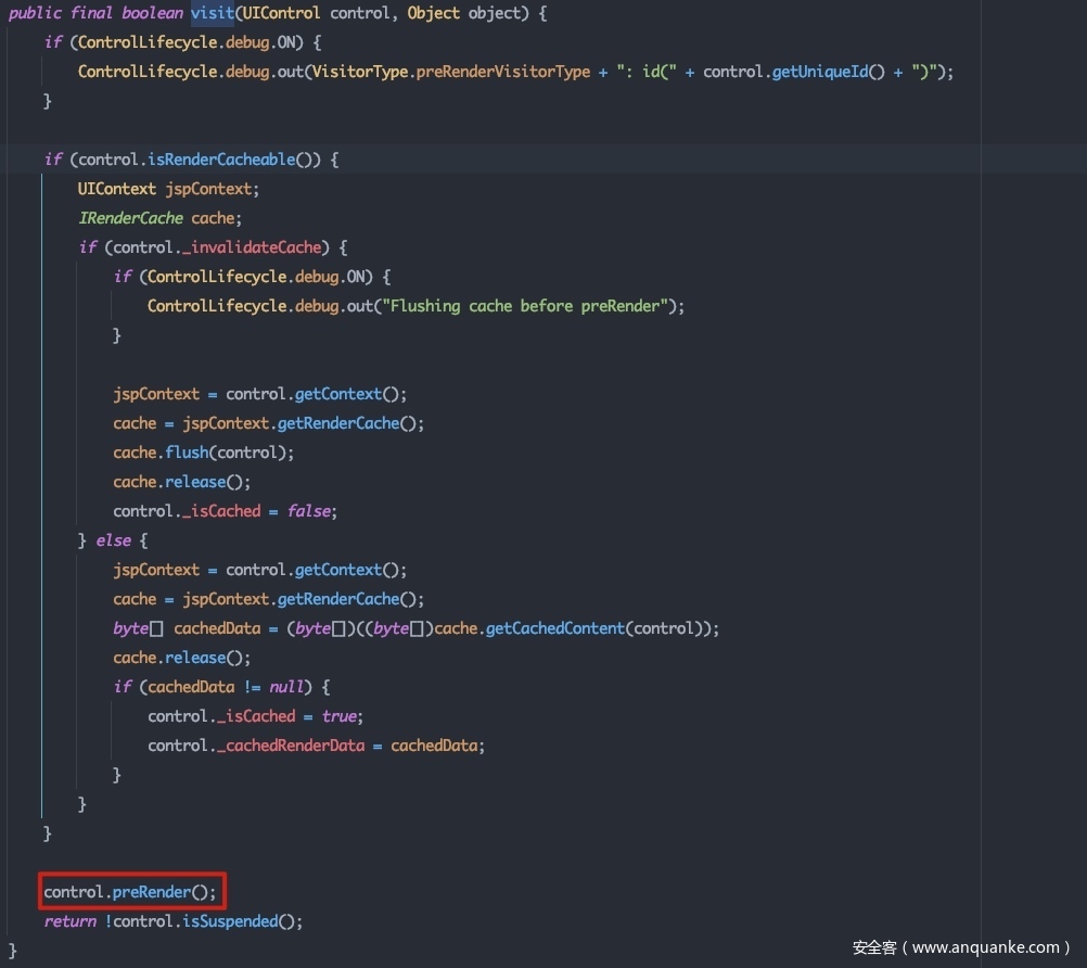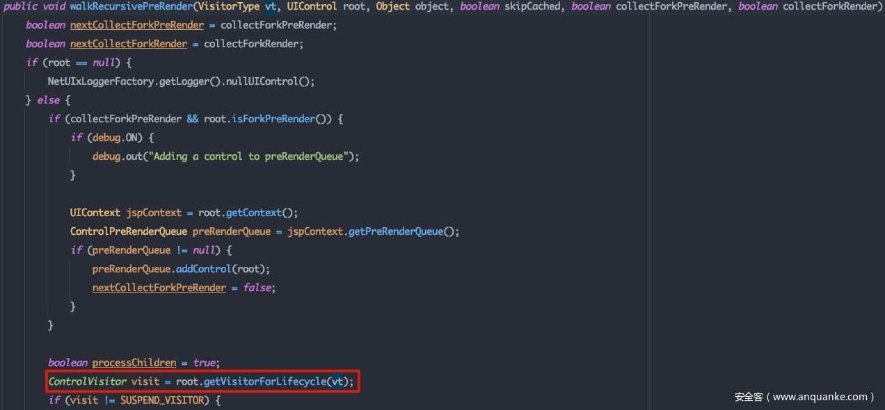 ControlVisitor visit = root.getVisitorForLifecycle(vt);这里将获取ControlLifecycle.preRenderVisitor以深度优先的方式遍历所有节点,并调用visit()方法。跟进看一下com.bea.netuix.nf.ControlVisitor#visit: