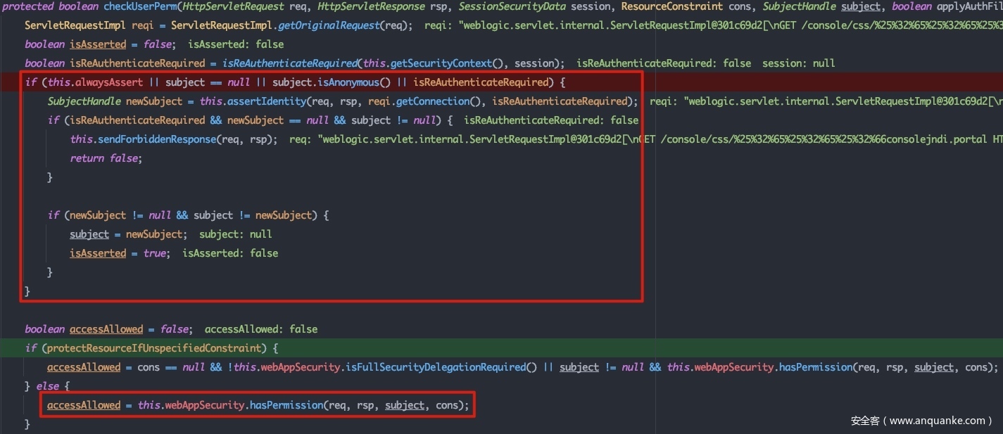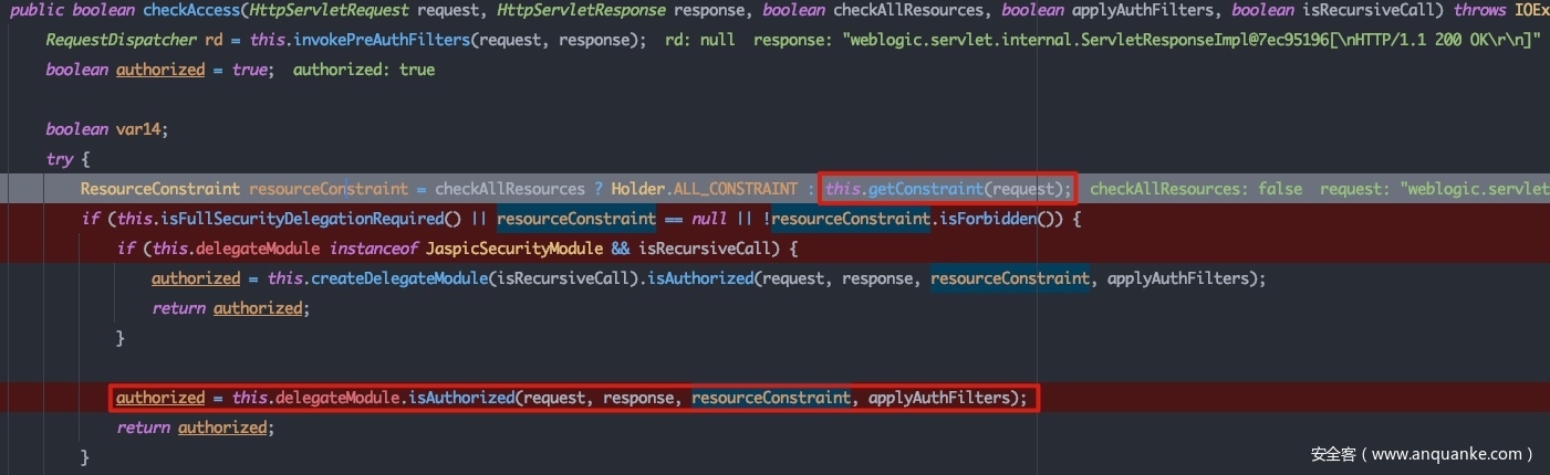 可以看到在weblogic.servlet.internal.WebAppServletContext中完成的权限校验。跟进具体看一下: