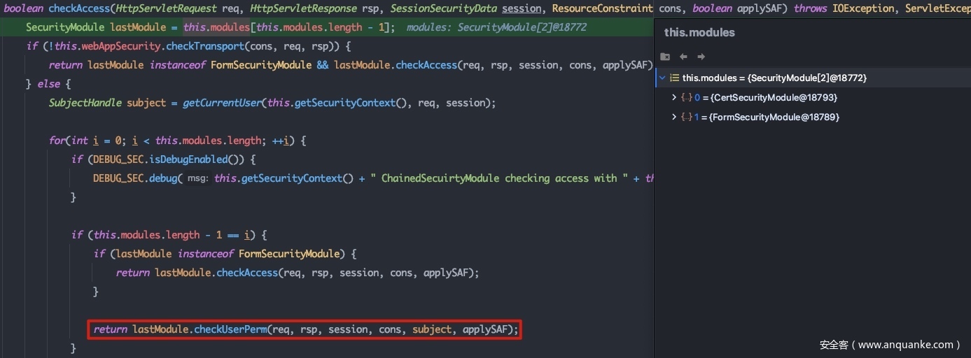 这里将执行流转换到CertSecurityModule#checkUserPerm方法中: