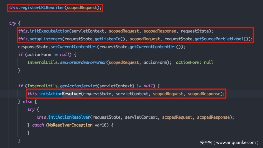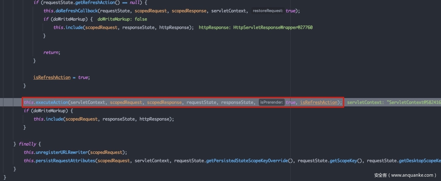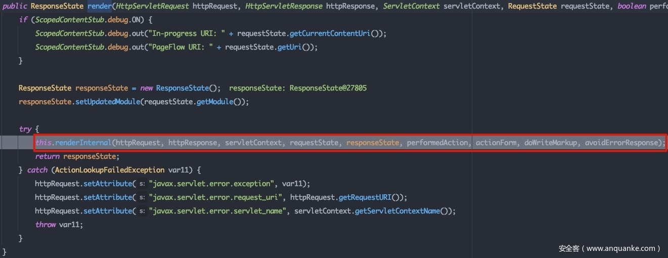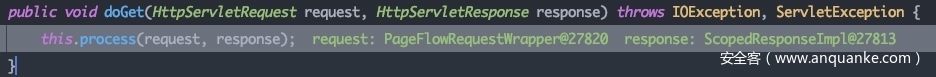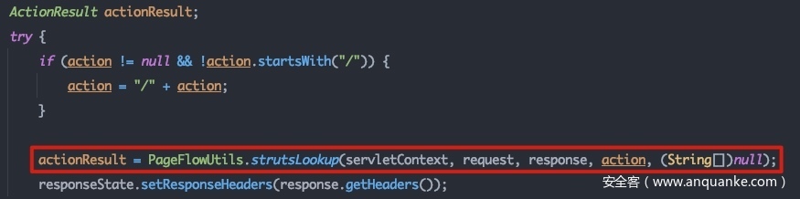 这里会调用PageFlowUtils#strutsLookup方法,该方法最终将会触发负责处理针对Action请求的servlet的doGet方法,调用链如下: