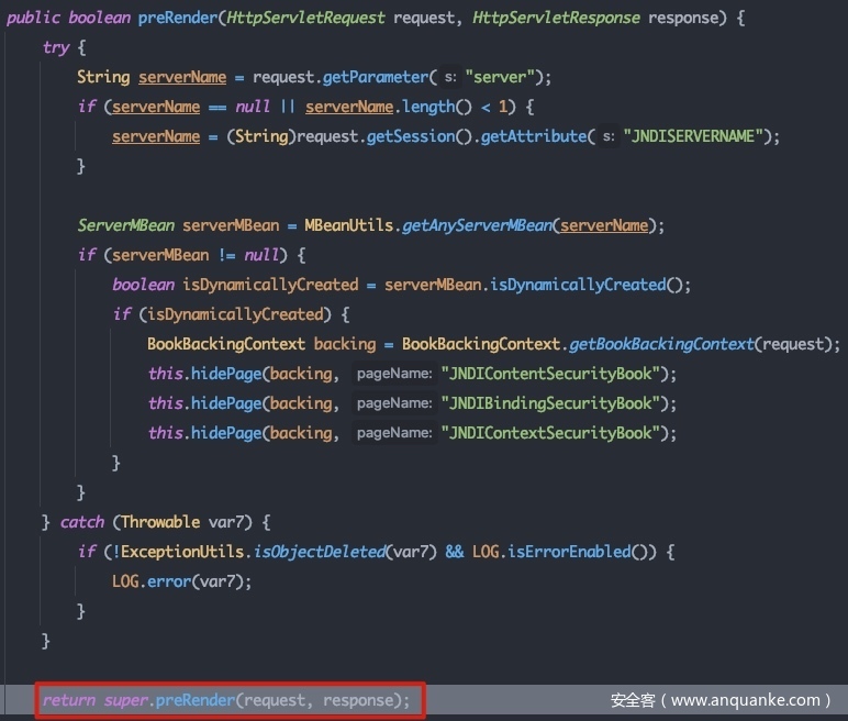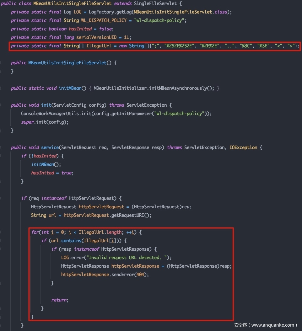 注意红框所标识的内容,oracle针对CVE-2020-14882的修补也是在这里针对url加了一个黑名单,并过了一遍黑名单: