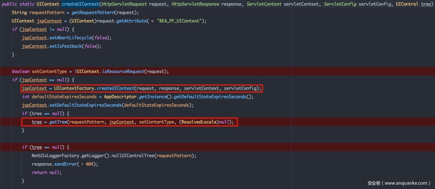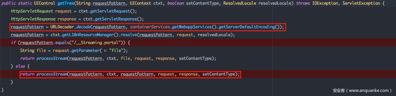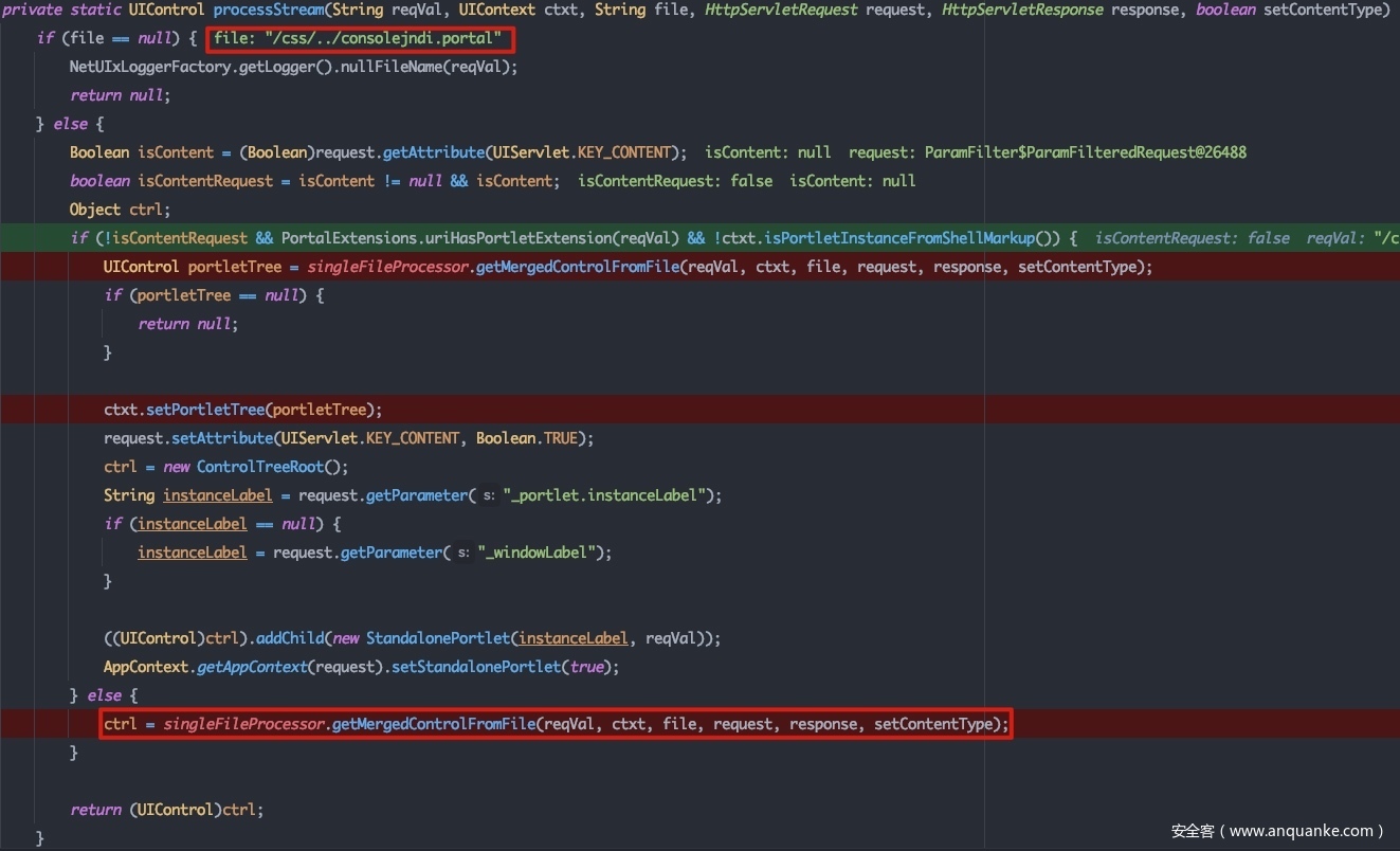 从上面的分析可知,想要访问非受限的资源,就需要构造符合路由表中的路由。从此我们也可以看出这里并非一个权限绕过操作,而是一个正常的访问非受限资源(如css文件这类资源)的操作,想要搞清楚为什么能因此而触发一个登陆后代码执行操作,就需要跟进UIServlet的具体处理流程中。