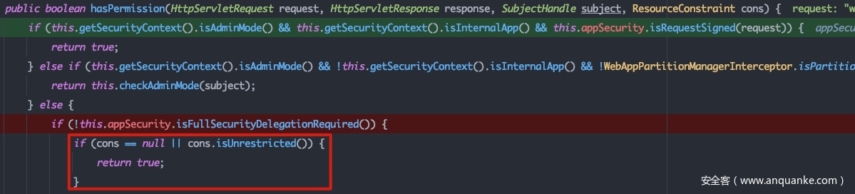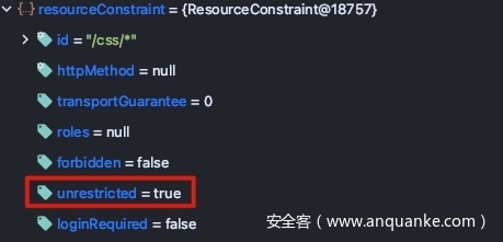 首先会根据session来确定是否需要重新登录,之后会判断是否为指定路由,如果是未指定的路由,则保护资源,由于我们这里访问的路由为/css,在指定的路由表中,所以这里是false。重点看hasPermission方法,这里会用到resourceConstraint中的unrestricted: