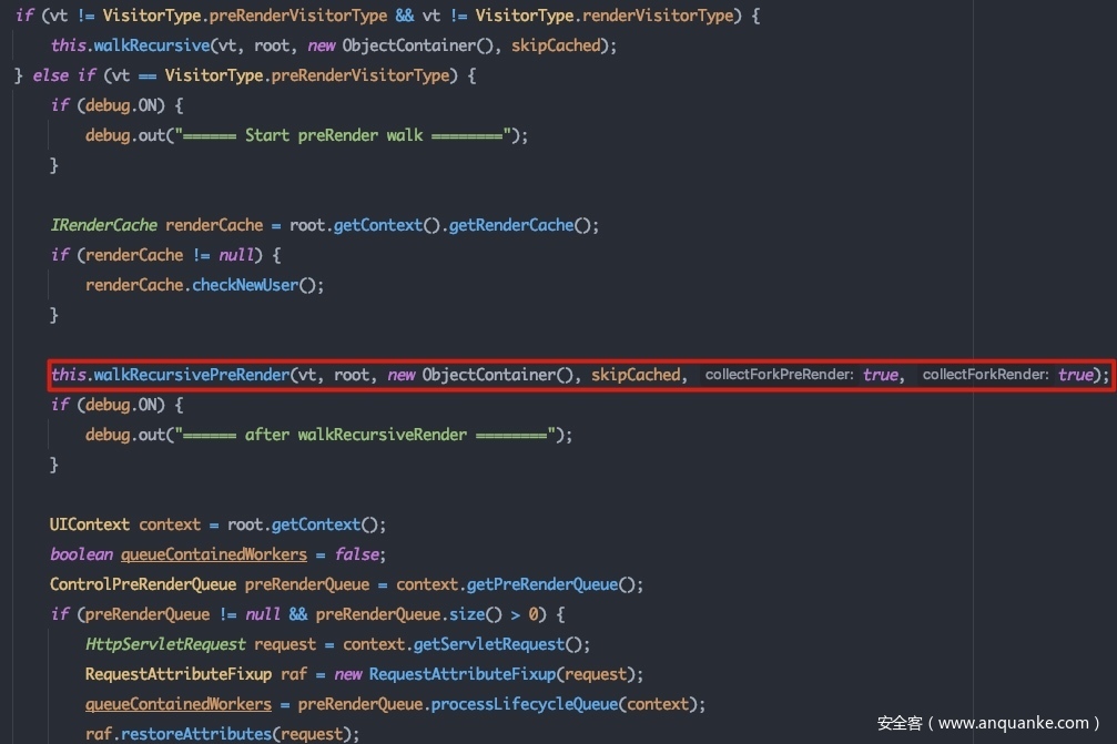 就如上面所说,关键逻辑还是调用传入控件的preRender()方法。接下来就会按照2.2.3中的所介绍的控件间关系进行深度遍历,在遍历到不同组件时会利用不同的方式触发代码执行流程。