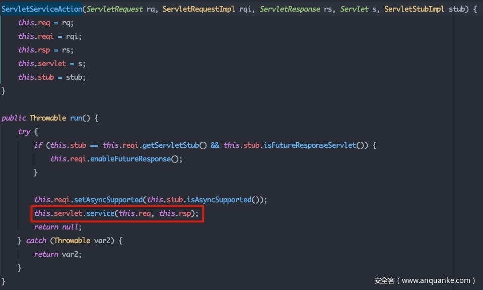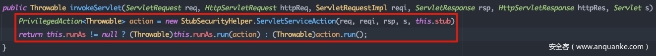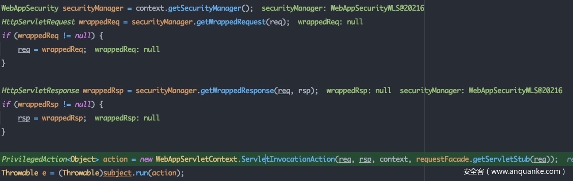 从subject.run(action)一路向下跟,在weblogic.security.acl.internal.AuthenticatedSubject#doAs中调用action的run方法,即跟进ServletInvocationAction#run: