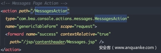 这里调用了strutsContent控件,同时标注了具体的action为MessagesAction。可以通过该action在struts-config.xml中找到其所对应的类: