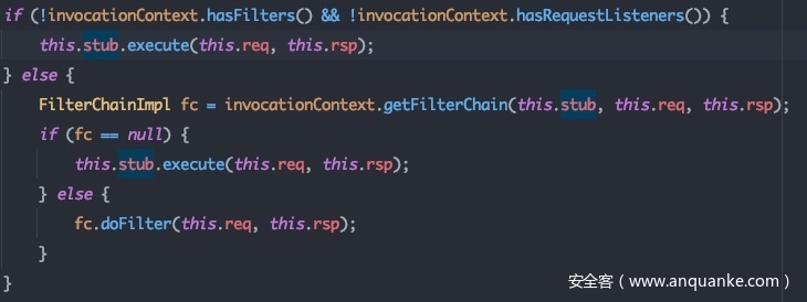 在调用execute方法前,会首先判断是否存在拦截器及请求监听器,若存在则执行对应的拦截器执行链,否则执行stub.execute()方法。跟进stub.execute()方法,即weblogic.servlet.internal.ServletStubImpl#execute: