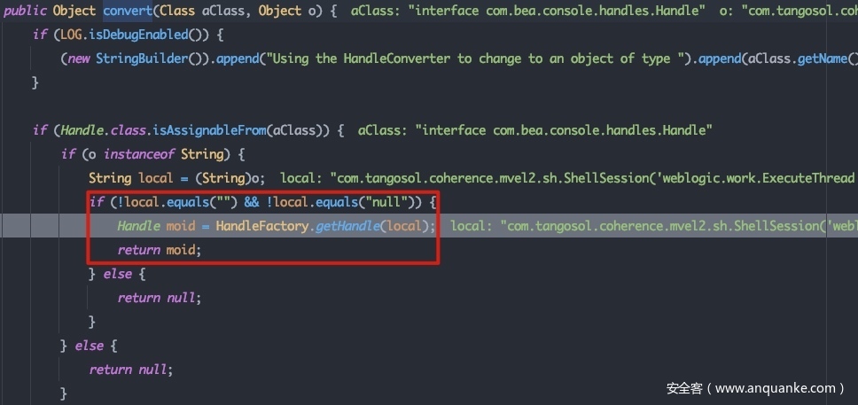 首先会将请求的参数进行解析,并映射到Map中,之后遍历所有的参数,当参数以handle结尾,则将其转换为Handle类型的对象。所以跟踪流程到com.bea.console.handles.HandleConverter#convert:
