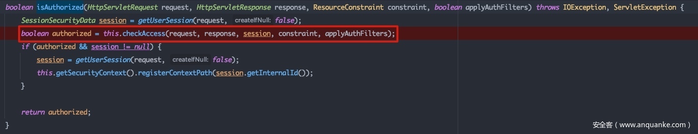 这里的unrestricted变量代表该路由是否为非受限路由,在后续鉴权时该变量会起关键性作用。当请求的路由是路由表中的路由时,该变量都为true。当完成resourceConstraint设置后,就会进入isAuthorized方法进行权限鉴定: