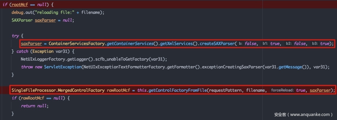 com.bea.netuix.servlets.manager.SingleFileProcessor#getMergedControlFromFile中首先会初始化SAX解析器,然后根据传入的文件路径获取到对应的.portal文件,并利用SAX解析器解析该.portal文件: