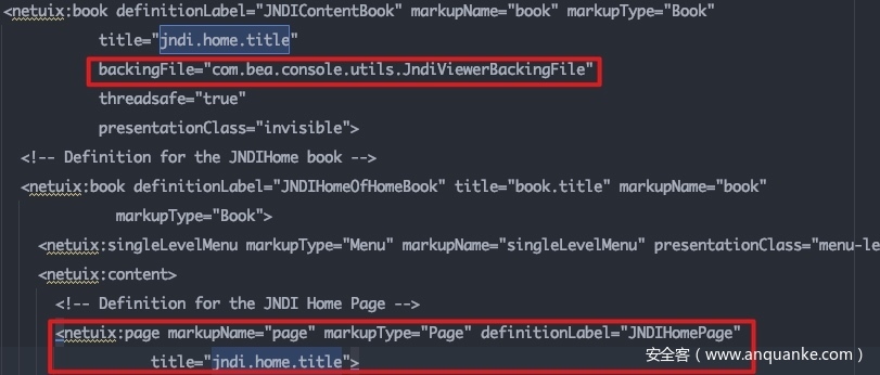 此处会根据book组件中所定义的title获取其backingFile的具体引用,在这里为com.bea.console.utils.JndiViewerBackingFile: