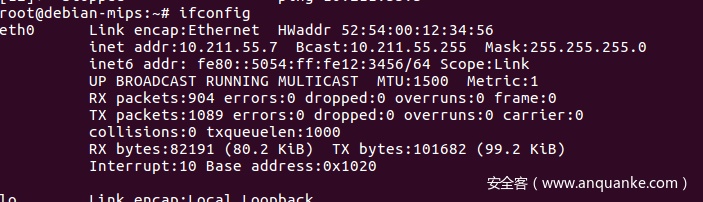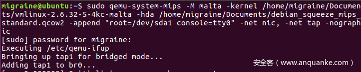 $ sudo qemu-system-mips -M malta -kernel vmlinux-2.6.32-5-4kc-malta -hda debian_squeeze_mips_standard.qcow2 -append "root=/dev/sda1 console=tty0" -net nic,macaddr=00:0c:29:ee:39:39 -net tap -nographic